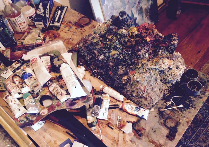 Thus began a most wonderful hour that I will always cherish; a memory I pray will never fade. Once inside, we sat across from each other immediately. My host was clearly exhausted but otherwise exuded a childlike animation. It was obvious that Bob’s human form had seen better days but his mind was sharp and the twinkle in his eye was as bright as a toddler’s. I tried to take in as much as I could from my stationary vantage point. Hung all around and stacked in batches against the walls were dozens of paintings in every size, some magnificently completed and many others, sadly, never to be finished. I noticed, on a small table, a thick mountain of dried paint that served as his palette, surrounded by tubes of color and bottles of brushes. An unmade bed rested off to the side.Bob's Palette