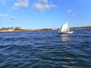 It was blowing about 10-15 when Alex picked me up to go for a sail, but 20 minutes later, by the time we put in at Stevens Landing on Rocky Neck, the wind had come up to 20-25 mph. “No problem”, says Alex.